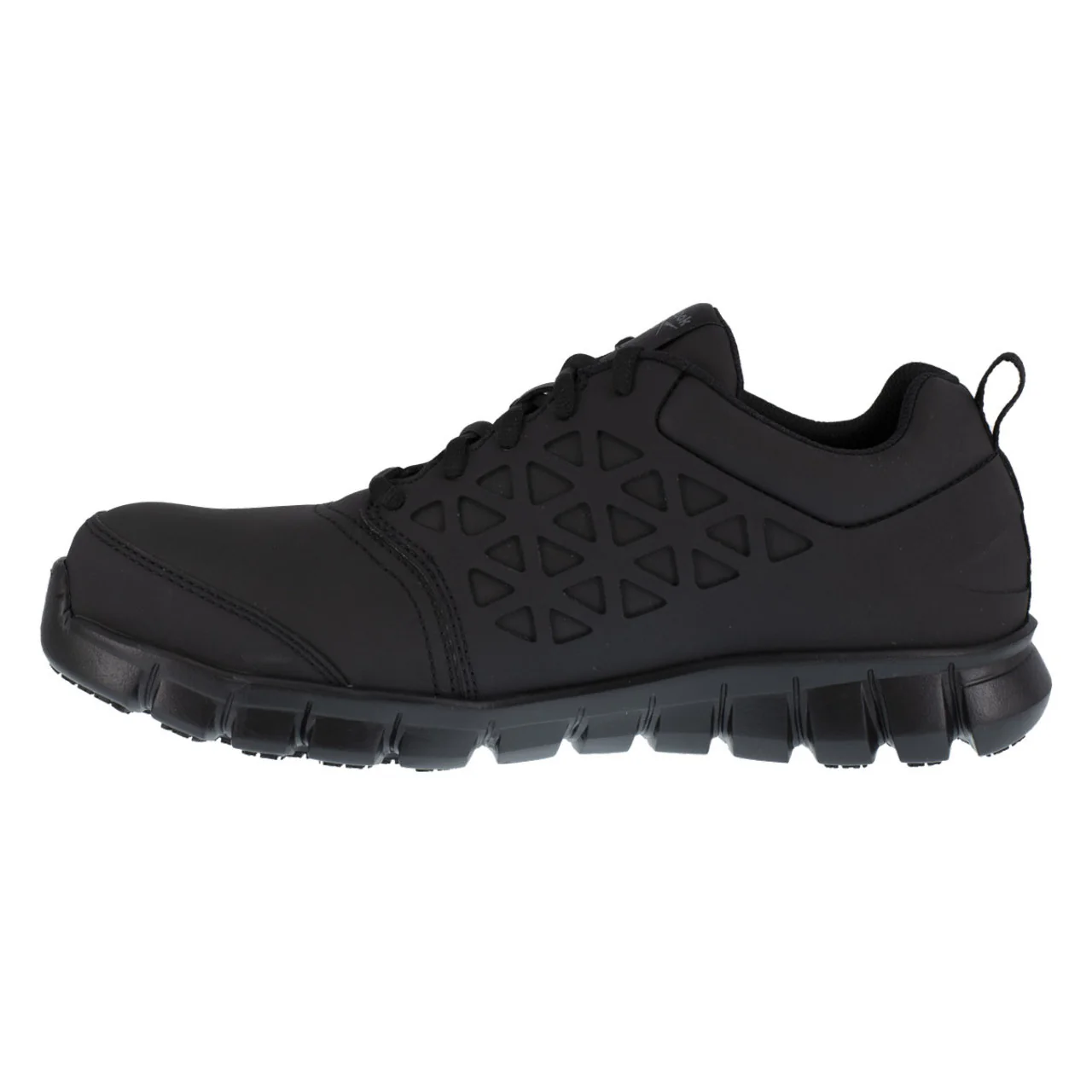 Reebok's Men's Sublite Cushion Work shoe achieves maximum lightness and flexibility. The all black design creates a classic look for your everyday wear. This composite toe athletic work shoe is designed with rubber pads that provide traction at heel strike and forefoot takeoff while minimizing weight. With a MemoryTech Massage footbed that adapts to the unique contours of your foot and an EXOFUSE upper for lightweight flexibility and water resistance, you won't have to worry about protection on the job. For your safety, this shoe features a slip resistant cover and has an electrical hazard protection. With deep flex grooves, the Sublite foam midsole reduces weight and allows for greater range of motion. The Sublite Cushion meets ASTM F2413 standards.